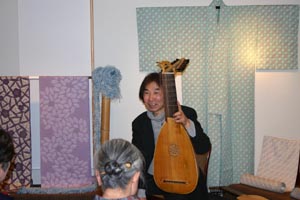 立川淑男さんによるリュートとバロック・ギター、ハーディーガーディーの演奏でした。立川さんは、<アルテクルブ企画展>99年7月に、「古楽器の復元展」で、登場して頂きましたが、<演奏家と聴衆が音楽によって作り出される時と空間を共有する>演奏の在り方を求めて、様々な作家とのコラボレーションを試みられています。その中でもなぜか、染織や織物の作家が多いそうです。<音織り人>と言うを出しているからでしょうか?今回使用した楽器は、リュートとバロック・ギター、ハーディーガーディーで、ハーディーガーディーは中世のヨーロッパに起源があります。シューベルトの「冬の旅」終曲の「ライエル回し」のライエルはこのハーディーガーディーのことだそうです。古楽器を手に全国をまわっている立川さんとイメージがだぶってきます。 |